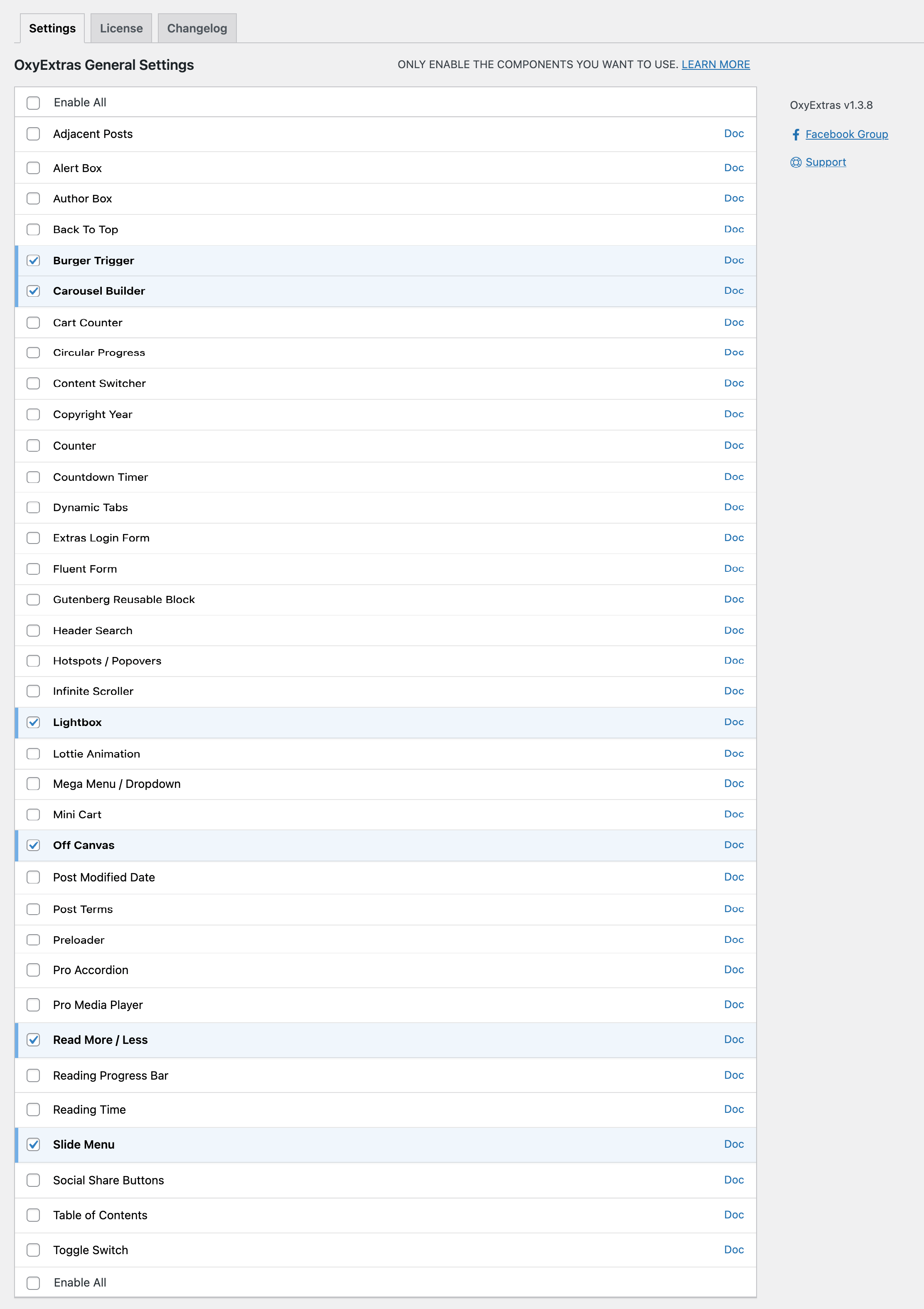 After the plugin has been licensed, go to the Settings tab, tick the components you would like to use and click “Save Changes” button.